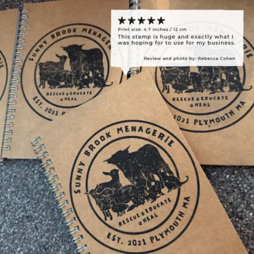 This large custom logo stamp will help you personalize shipping boxes, pizza boxes, paper bags, shipping envelopes, your product packaging, and cotton or linen bags. The small stamp is perfect for cards, labels, creating your stickers, and stamping envelopes and small boxes.